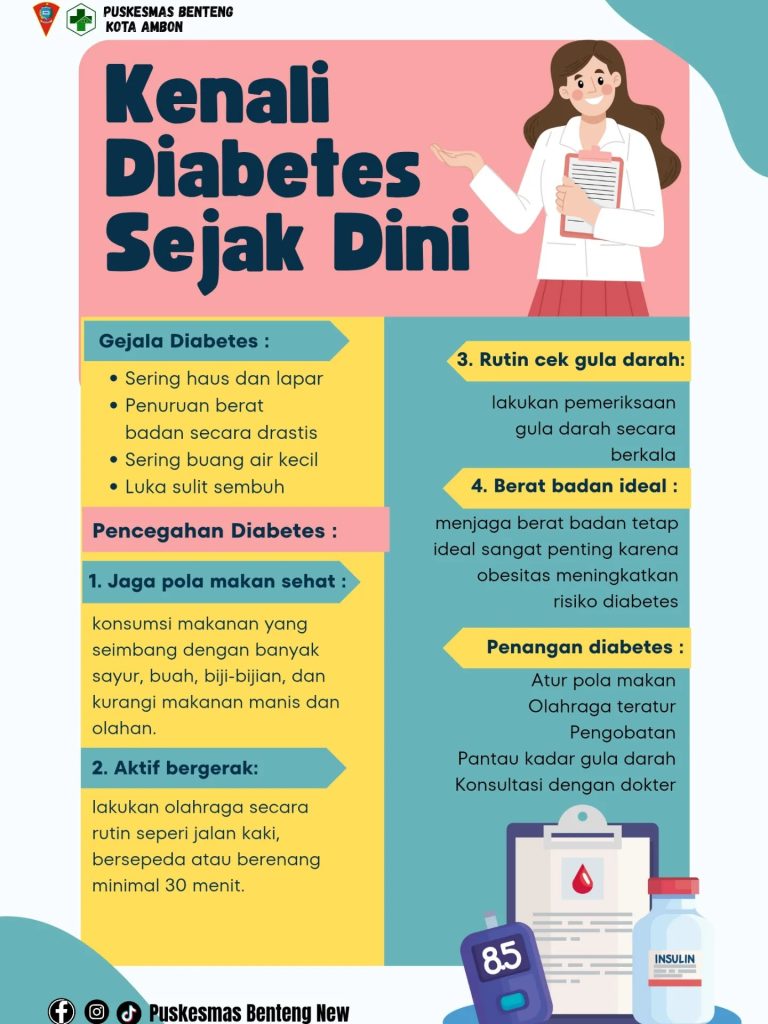 Infografis edukasi kesehatan yang memuat informasi gejala, pencegahan, dan penanganan diabetes untuk meningkatkan kesadaran masyarakat.