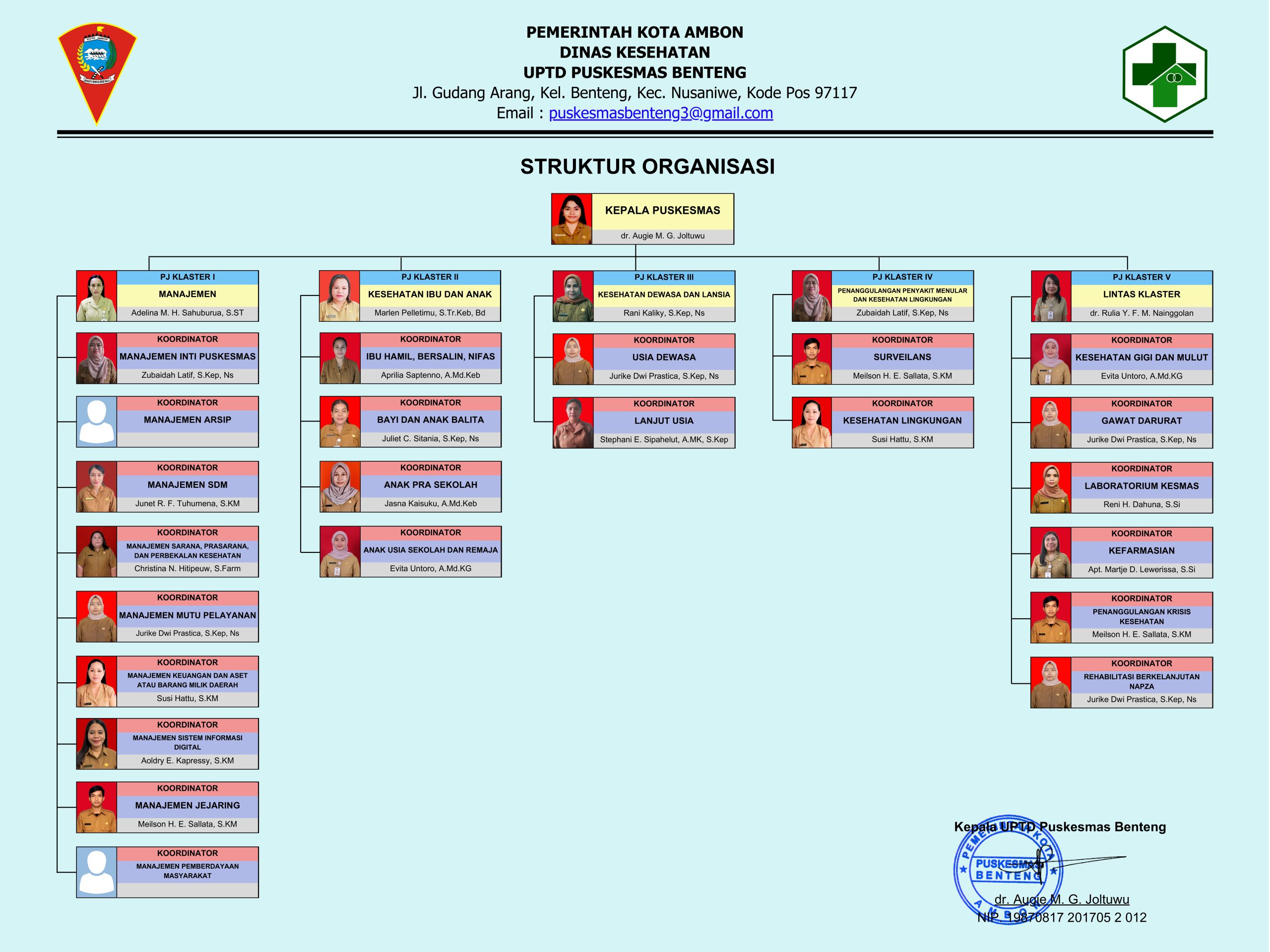 Struktur organisasi Puskesmas Benteng Kota Ambon menggambarkan susunan jabatan serta pembagian tugas dan tanggung jawab dalam penyelenggaraan pelayanan kesehatan kepada masyarakat. Struktur ini disusun untuk mendukung koordinasi kerja dan kelancaran pelaksanaan program pelayanan di lingkungan Puskesmas.